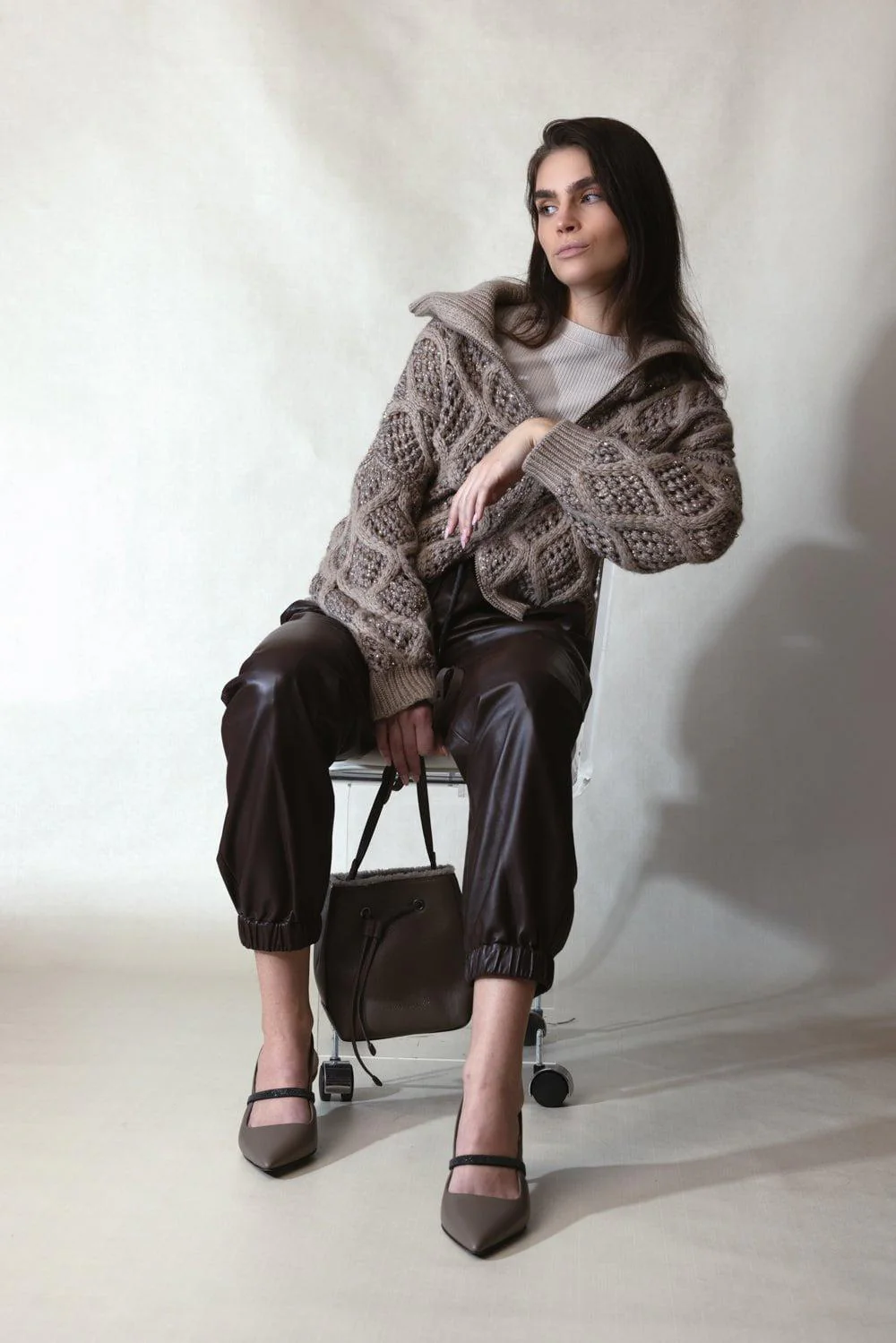Brunello Cucinelli dazzling net cable cardigan in brown.