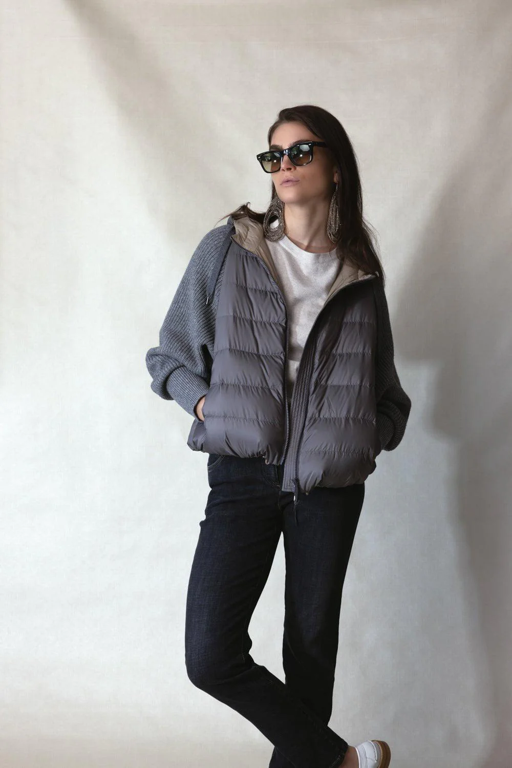 Brunello Cucinelli ribbed sleeve padded vest in grey.