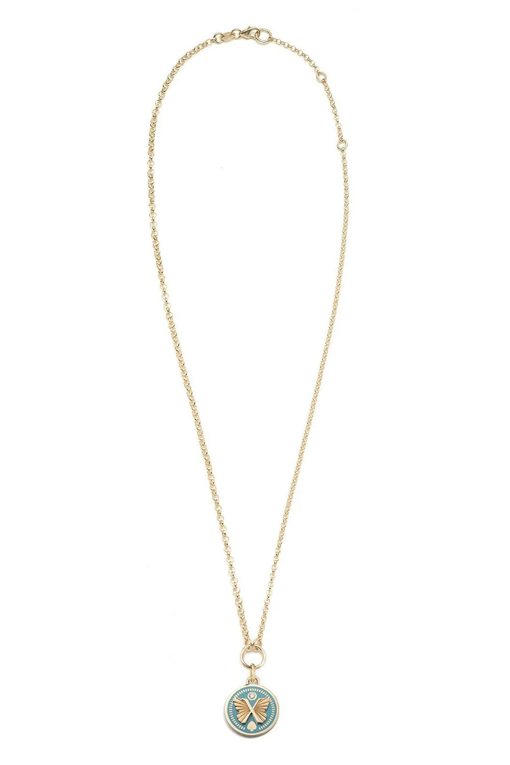 Handcrafted in 18k yellow gold and fused with aqua ceramic, this Petite Butterfly Mixed Belcher Necklace represents Reverie. Meaning daydreaming; floating between reality, fantasy, and memory. Connect your conscious and unconscious. Seek out what lights you up. Seek what gives you energy. Elevated positive energy is the catalyst of change that allows us to reconnect and align with our souls to create joy. These symbols evoke, rather than just describe, Joy. The Aqua portions of this medallion is crafted using a highly durable ceramic achieving a high-shine, intense color that does not fade. Chemical-resistant, heat-resistant and bio-compatible. Harmless to humans, nature, and everything in between.
