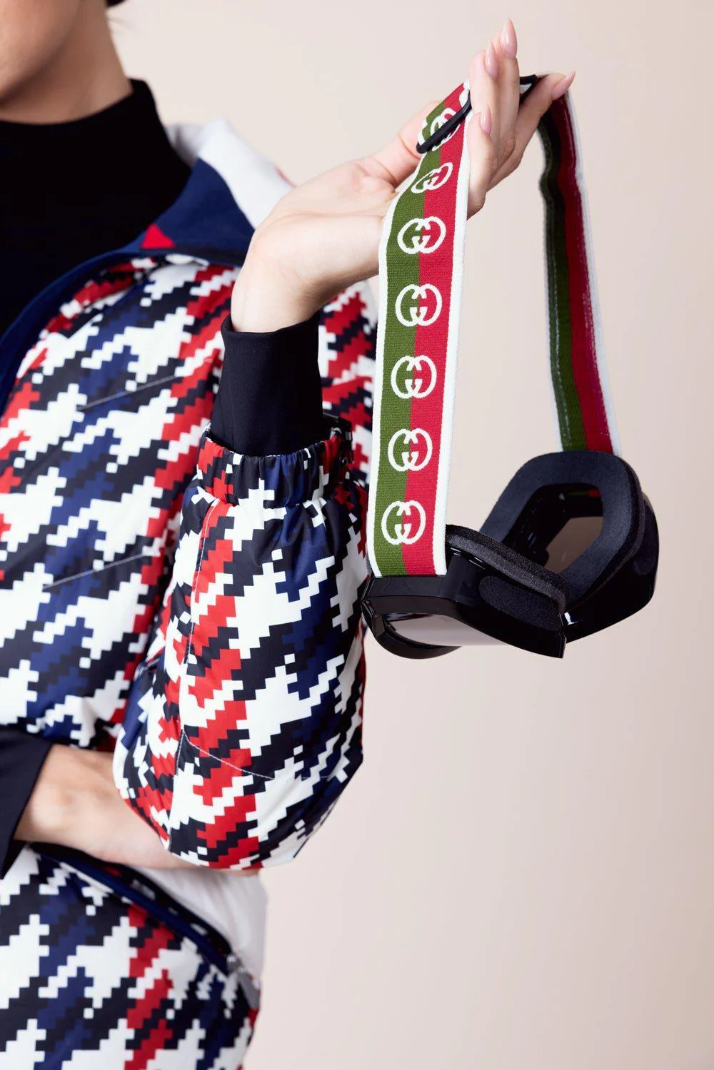 A ski mask fit for glossy mountain peaks, with sporty details and technical features. Here the black frame is decorated with the name of the House, while an Interlocking G green and red strap add a logo feel to the design. An understated dark grey lens completes this style.