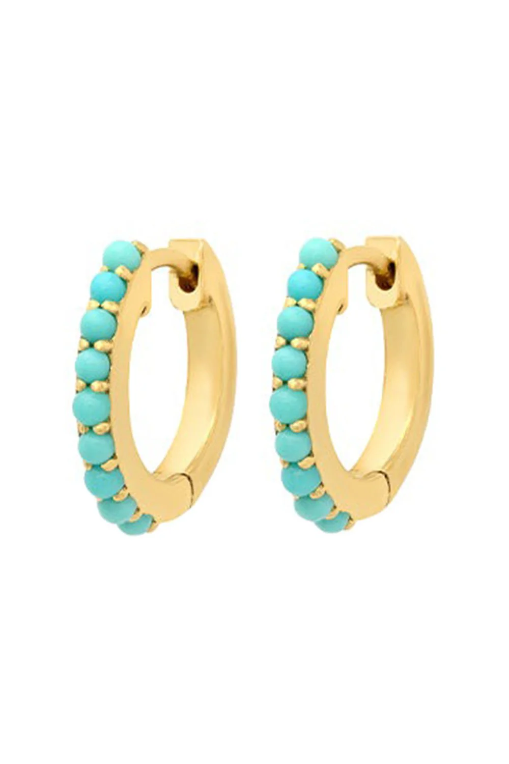 Jennifer Meyers small turquoise huggie earrings in yellow gold.